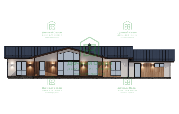 Экстерьер дома построен на эффектном контрасте фактур: белоснежные оштукатуренные стены гармонируют с вертикальным деревянным планкеном теплых оттенков. Массивная двускатная кровля с глубокими свесами не только защищает фасады, но и формирует уютное крытое пространство над террасой. Огромные панорамные окна «в пол» стирают границу между интерьером и ландшафтом, наполняя дом естественным светом.