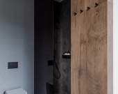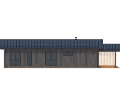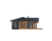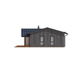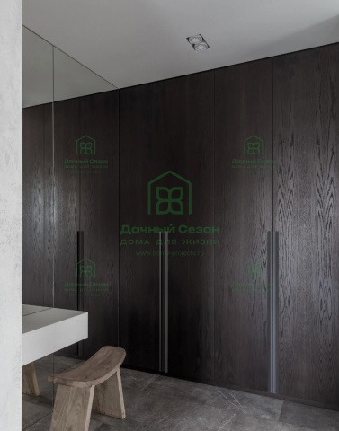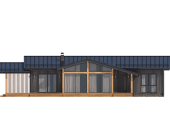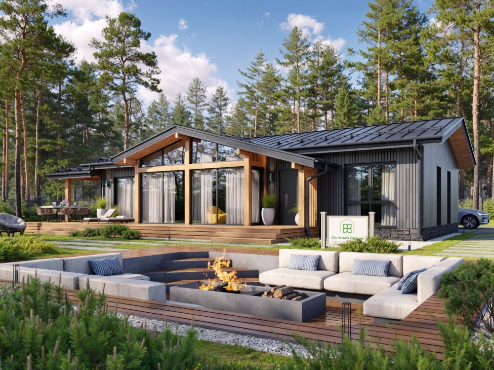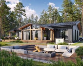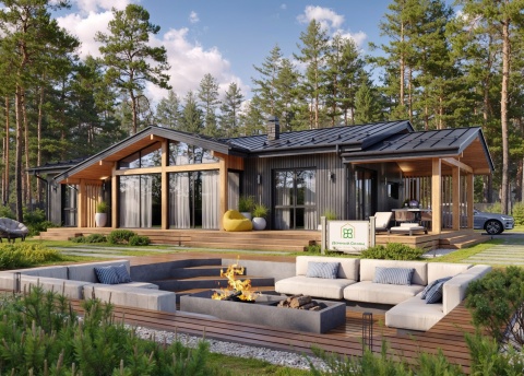 Лаконичный фасад с характерными фахверковыми элементами и большими панорамными окнами придаёт дому лёгкость и ощущение единения с природой. Пространство внутри организовано максимально удобно: просторная гостиная с высоким потолком объединена с кухней и столовой, создавая единое светлое пространство для жизни и общения.
