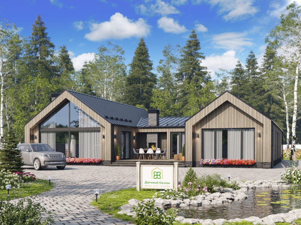 Фасад: сочетание тёплого дерева, тёмной кровли и больших стеклянных проёмов. Дом выглядит дорого, современно и органично вписывается в любой ландшафт.