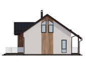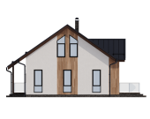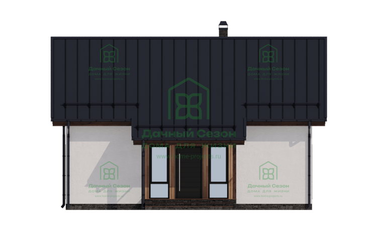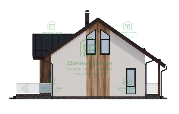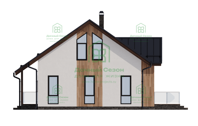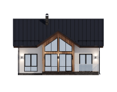 Главным украшением дома является панорамное остекление центрального фасада, которое переходит в высокий фронтон. Это решение не только придает зданию статусности, но и обеспечивает интерьер «вторым светом» — в гостиной всегда будет много естественного освещения и воздуха. Для отдыха на свежем воздухе предусмотрена просторная терраса площадью 21 кв. м, которая фактически становится продолжением жилого пространства в теплое время года.