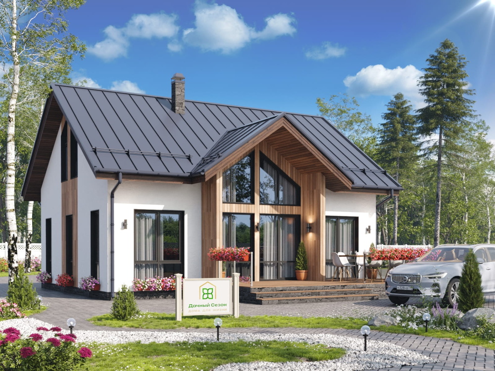 Проект «Нэрн» (160 кв. м) — это современный двухэтажный дом мансардного типа с линейными размерами 8х10 м. Он идеально подходит для тех, кто ищет баланс между компактным пятном застройки и ощущением безграничного пространства внутри. Архитектура дома построена на сочетании строгой графитовой кровли, белоснежных фасадов и теплых текстур дерева, что делает его органичным дополнением любого природного ландшафта.