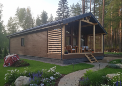 Утеплённый каркас, крыша, окна, двери — всё готово. Внутри базовая черновая обшивка OSB — можно отделывать под себя. Идеально, если хотите контролировать ремонт и экономить на готовых решениях.