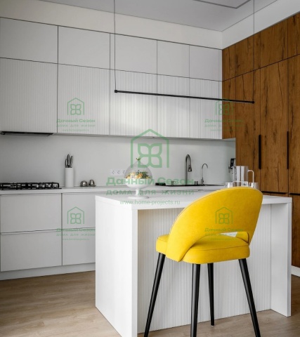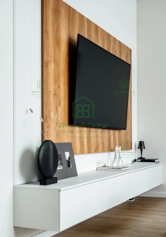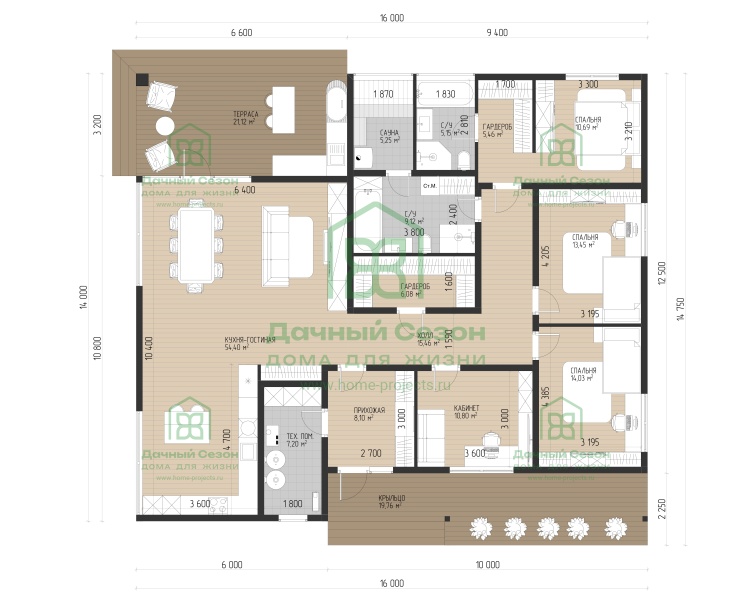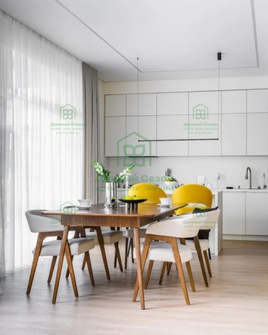 В центре проекта — большая кухня-гостиная 54,4 м². Здесь легко представить длинные семейные ужины, шумные выходные с друзьями и тихие вечера у дивана. Пространство грамотно зонировано, много света и прямой выход на просторную террасу 21 м² — идеальное продолжение гостиной в тёплое время года.