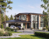 - Представительный фасад в стиле современного минимализма и натуральными материалами: дерево, камень, большие панорамные окна от пола до потолка, кровля с выразительными свесами