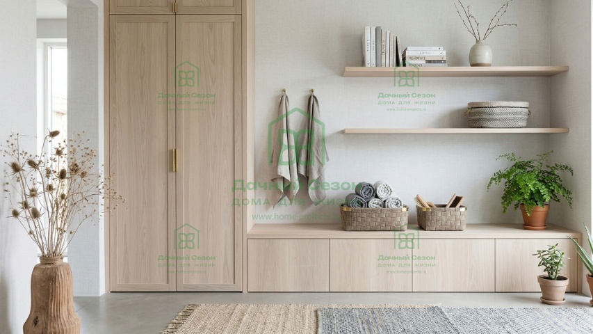 При входе расположен светлый холл-прихожая (9,74 кв.м.).