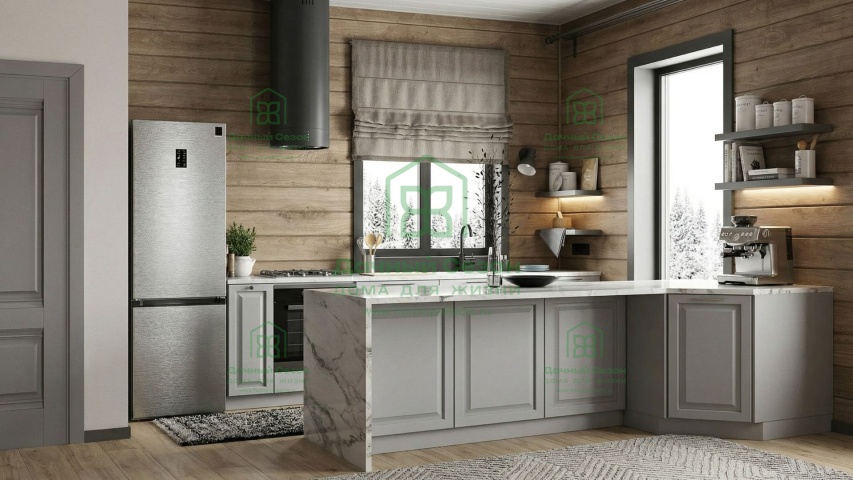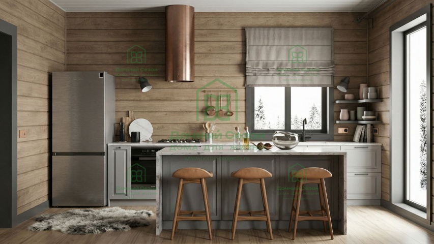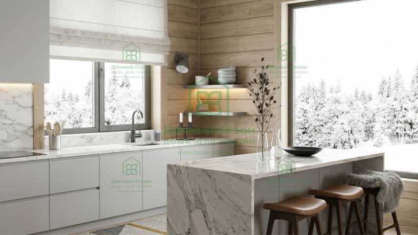 Правое крыло дома занимает просторная кухня-гостиная (57,72 кв.м.).