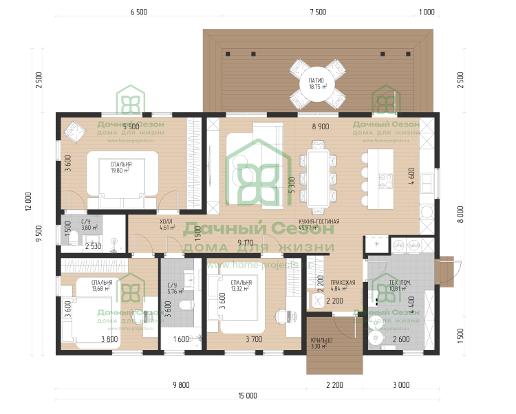 - Спальный блок: "родительская" спальня 19,8 м² со своим санузлом, а также две дополнительные спальни 13,68 м² и 13,32 м².