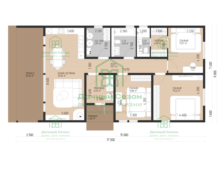 Три полноценные спальни: мастер-спальня 19,32 м² для родителей и две уютные комнаты площадью 13,86 м² и 13,57 м².