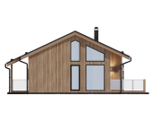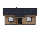 Архитектурный стиль: Дом выполнен в стиле скандинавского минимализма. Лаконичная архитектура подчеркивается вертикальной отделкой фасада деревом теплых оттенков в сочетании с графитовыми элементами кровли и оконных рам. Особое внимание привлекает фронтонное остекление, которое не только обеспечивает панорамный вид, но и является ключевым элементом дизайна.