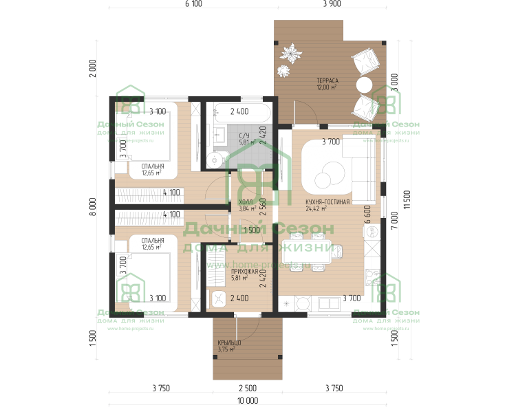 Летние помещения: Уютное крыльцо (3,75 м²) и большая открытая терраса площадью 12,00 м².