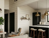 Внешний облик дома формируется за счет контрастного сочетания белой штукатурки, теплых деревянных вставок и графитовой фальцевой кровли. Панорамное остекление не только делает фасад стильным, но и визуально расширяет внутренние помещения.